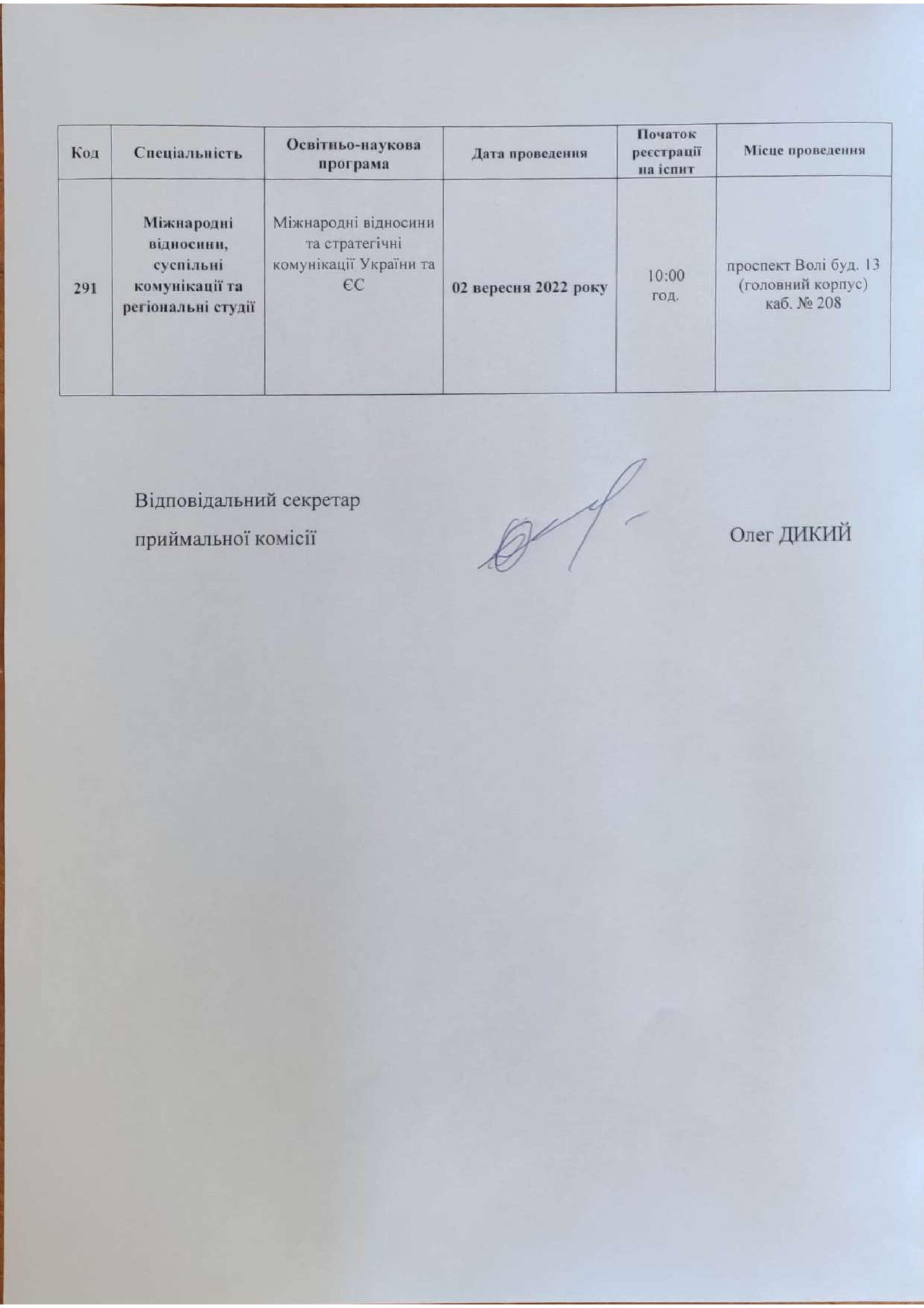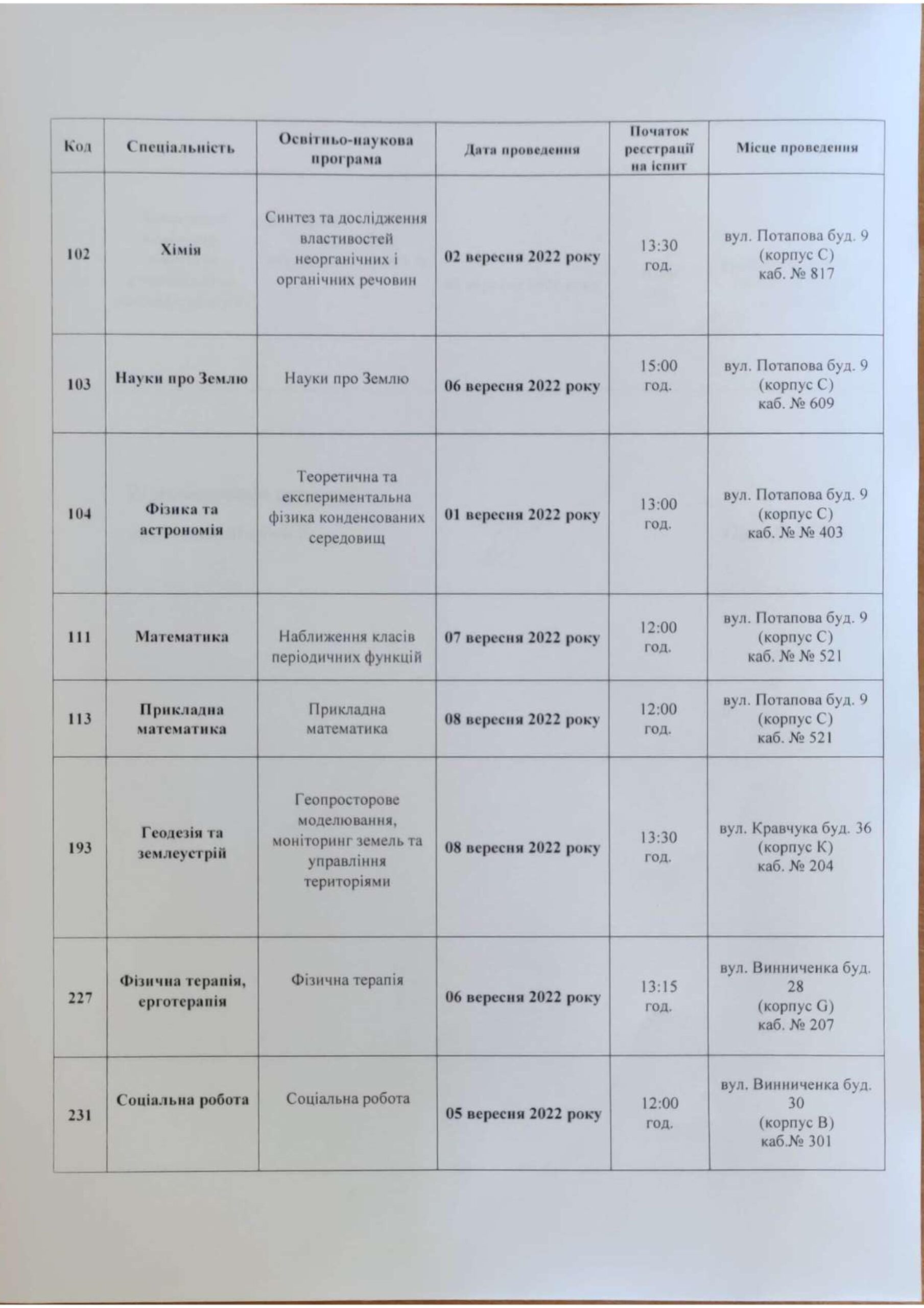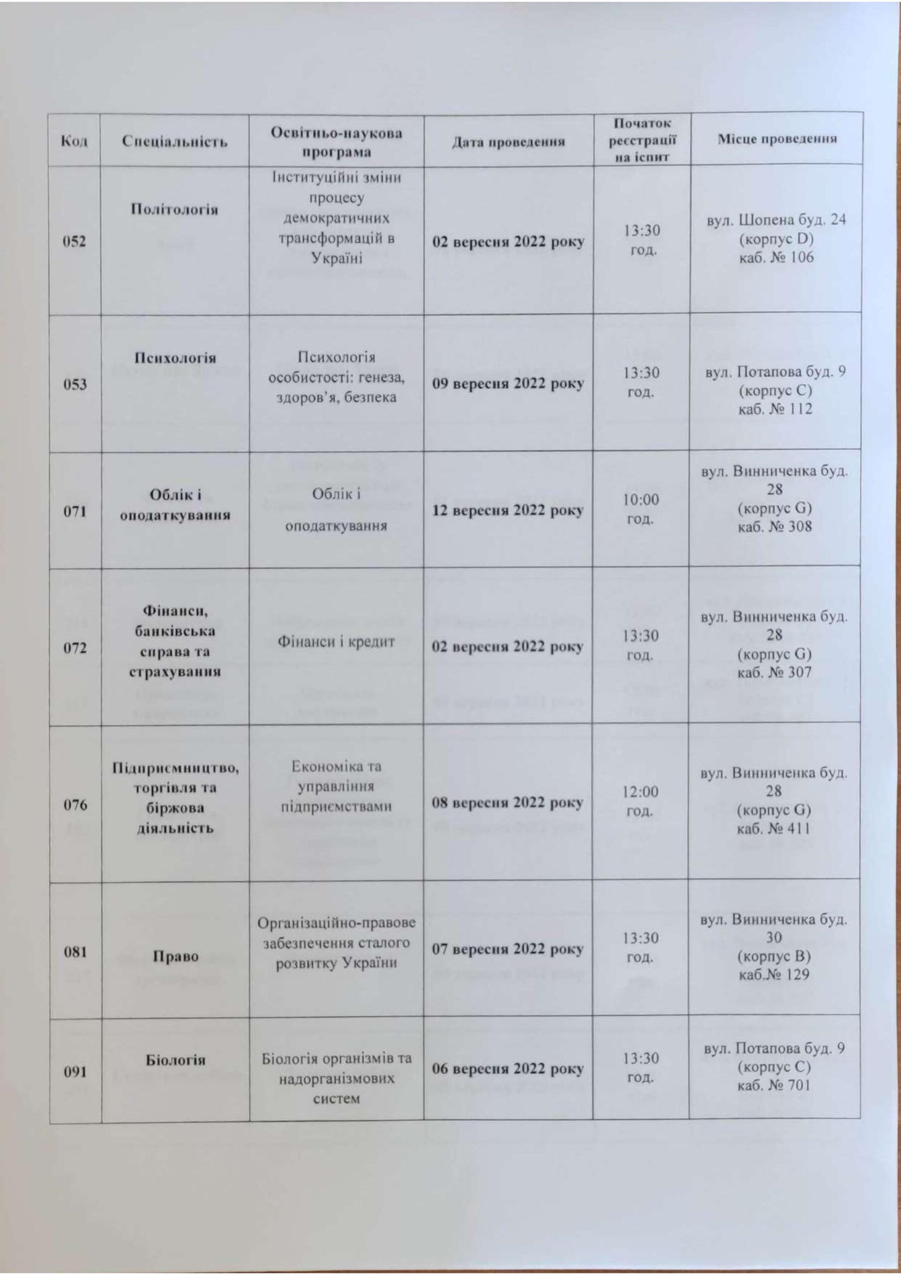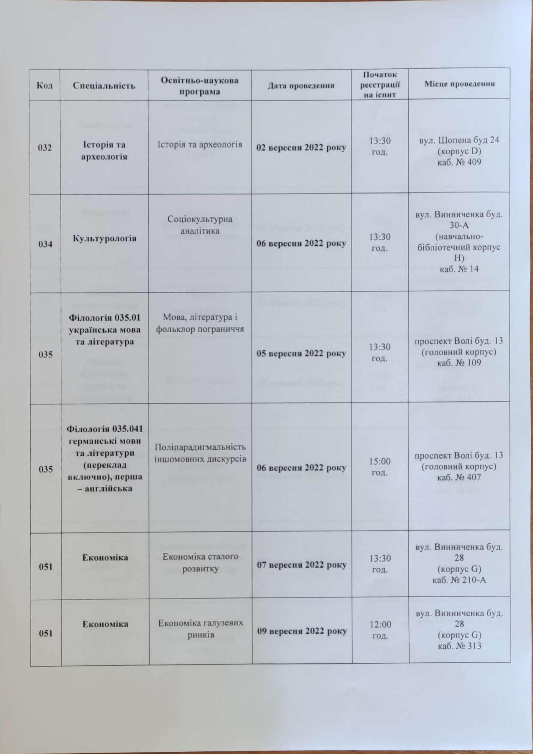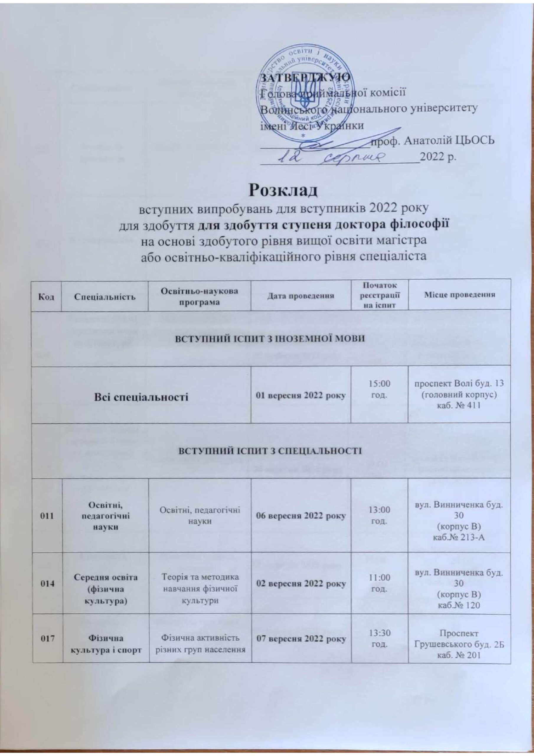 Розклад вступних випробувань до аспірантури